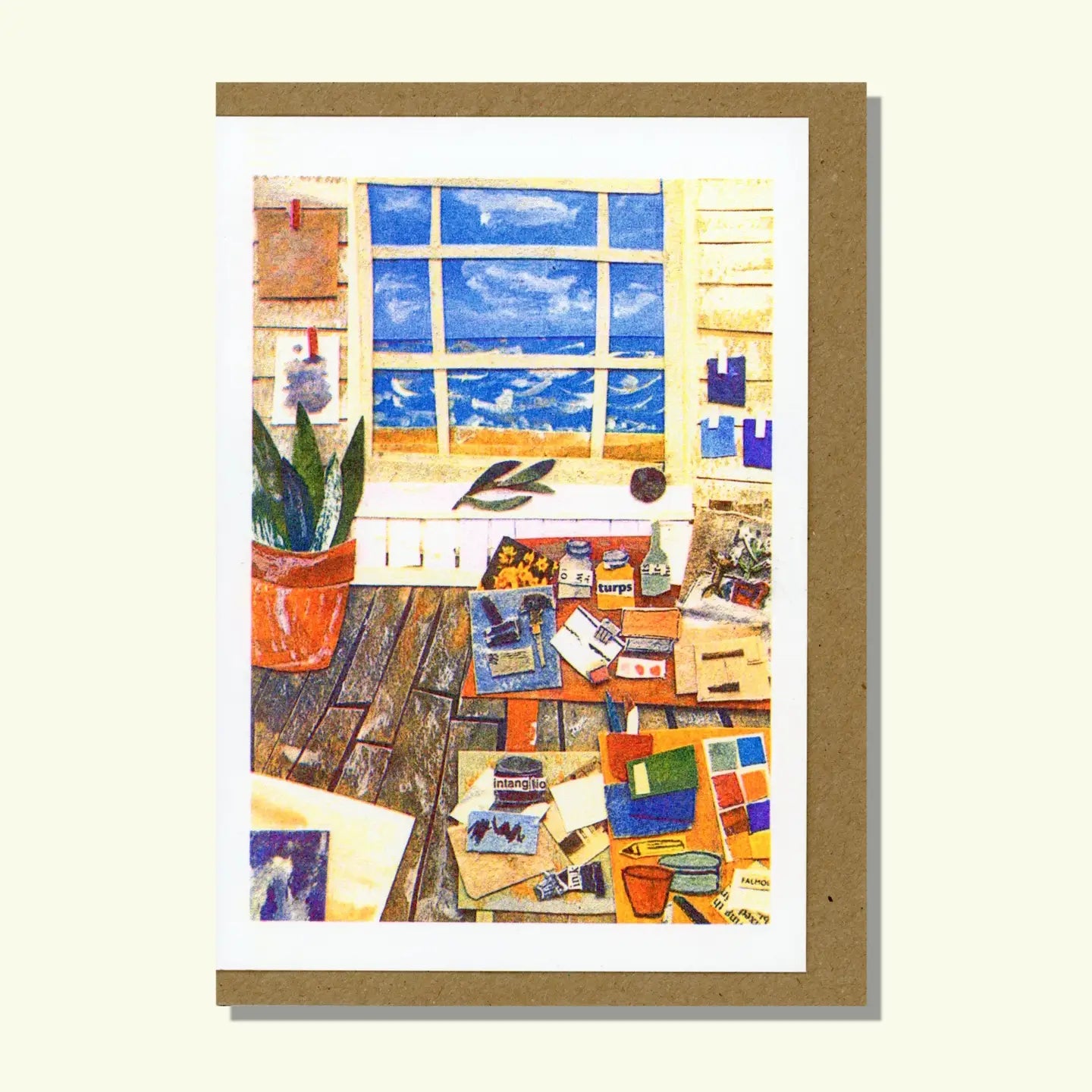 A single risograph greetings card depicting an artist studio by the sea. The artwork is taken from an original collage created from found materials and hand-painted papers.