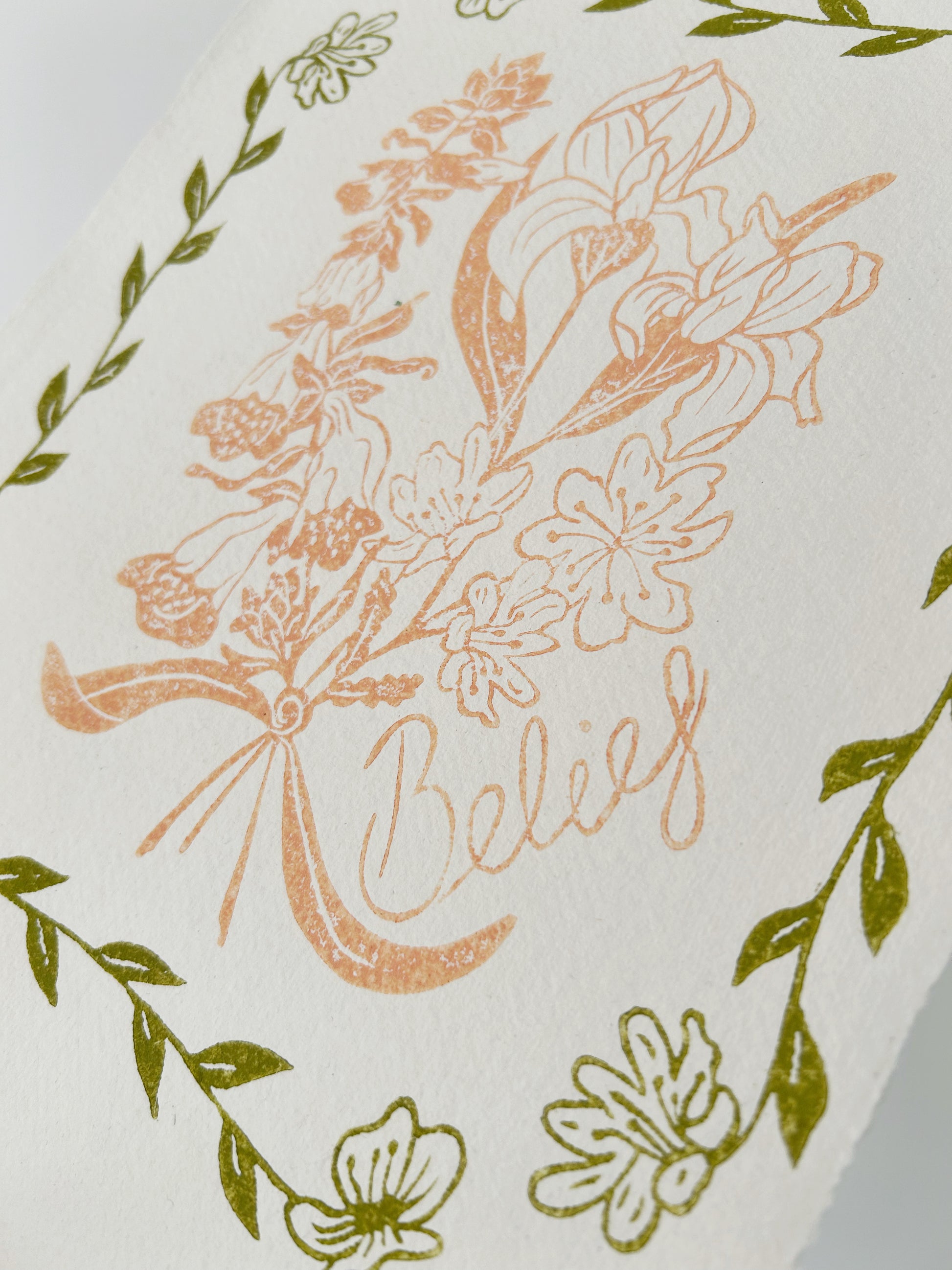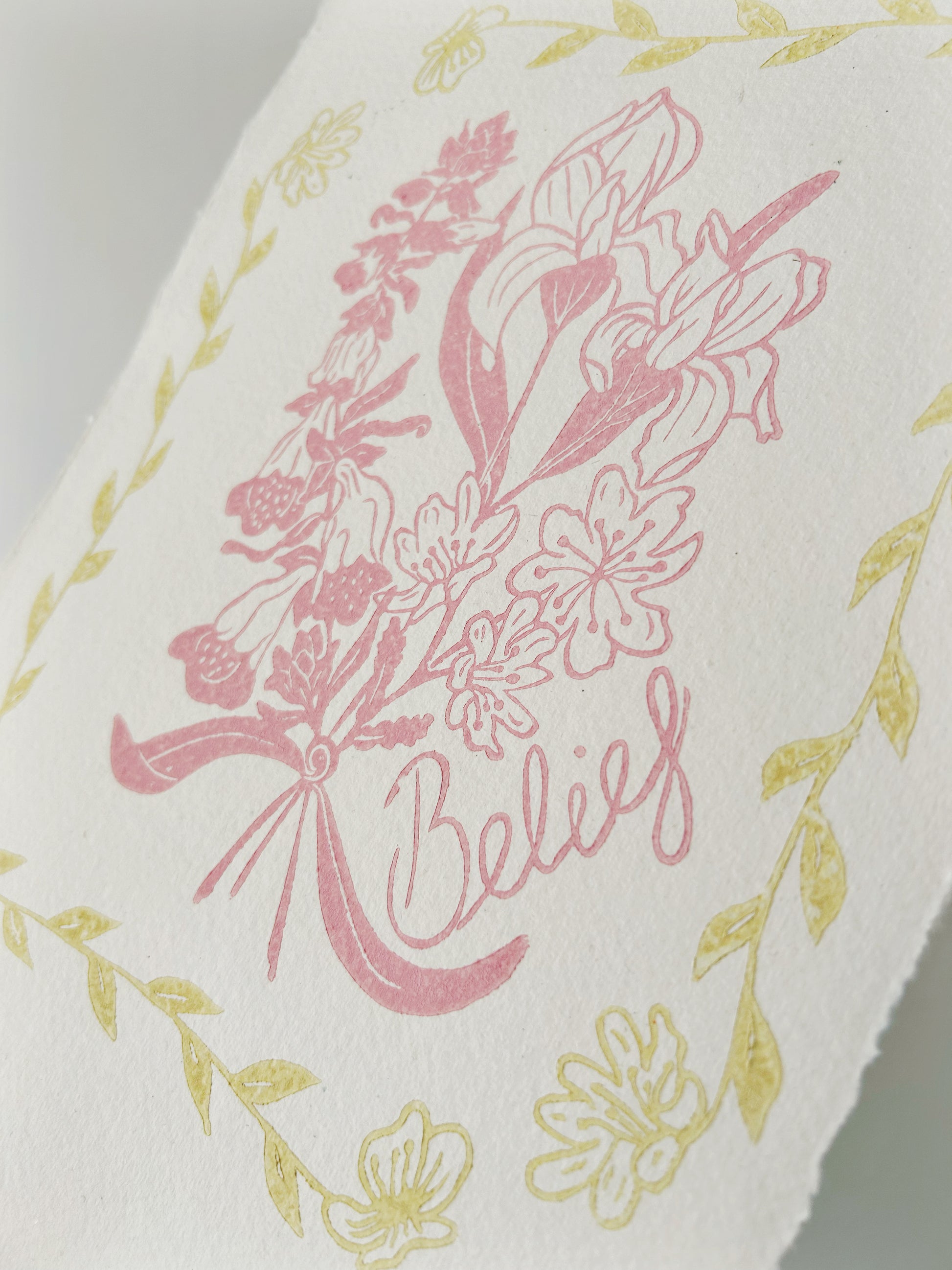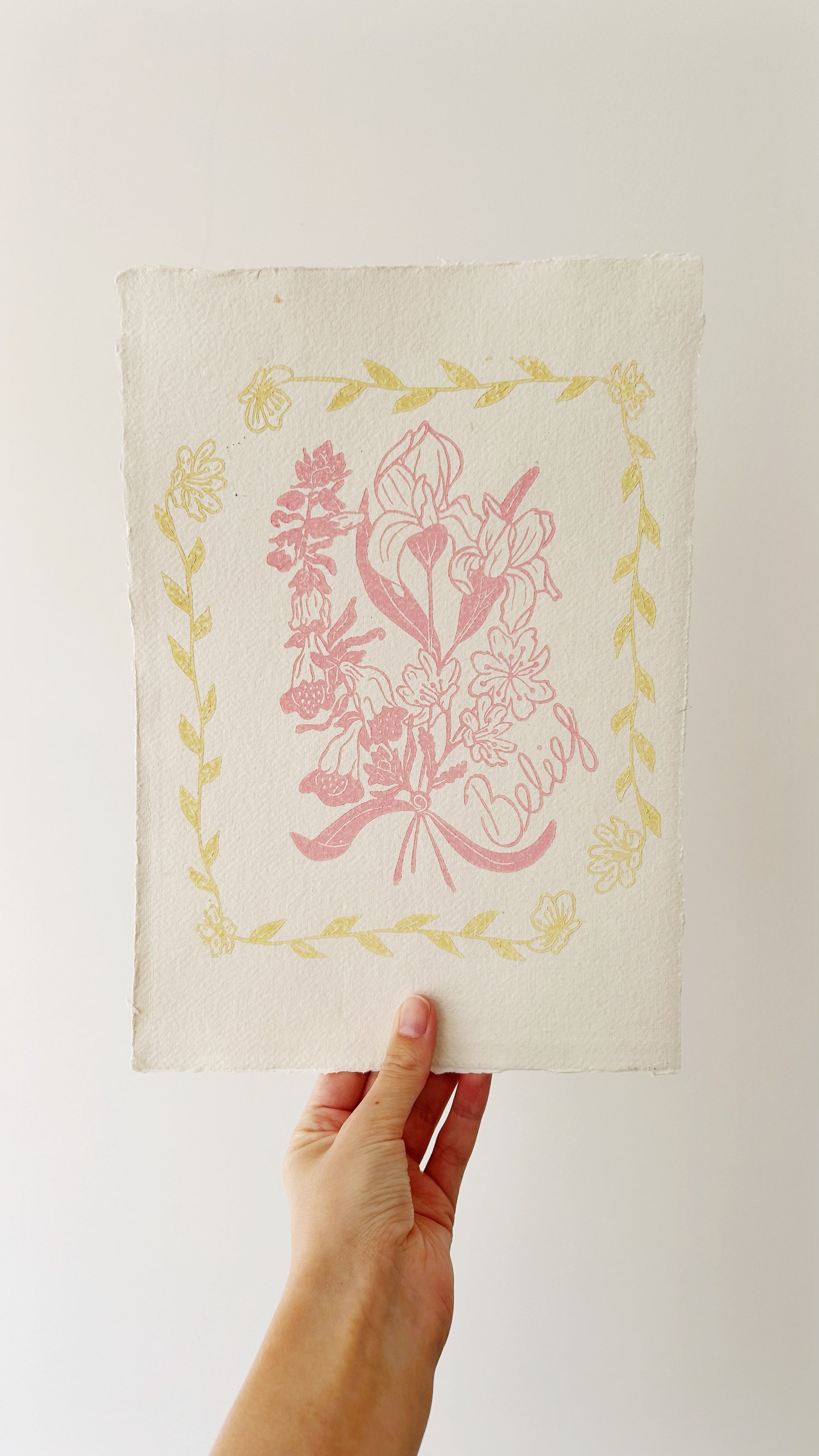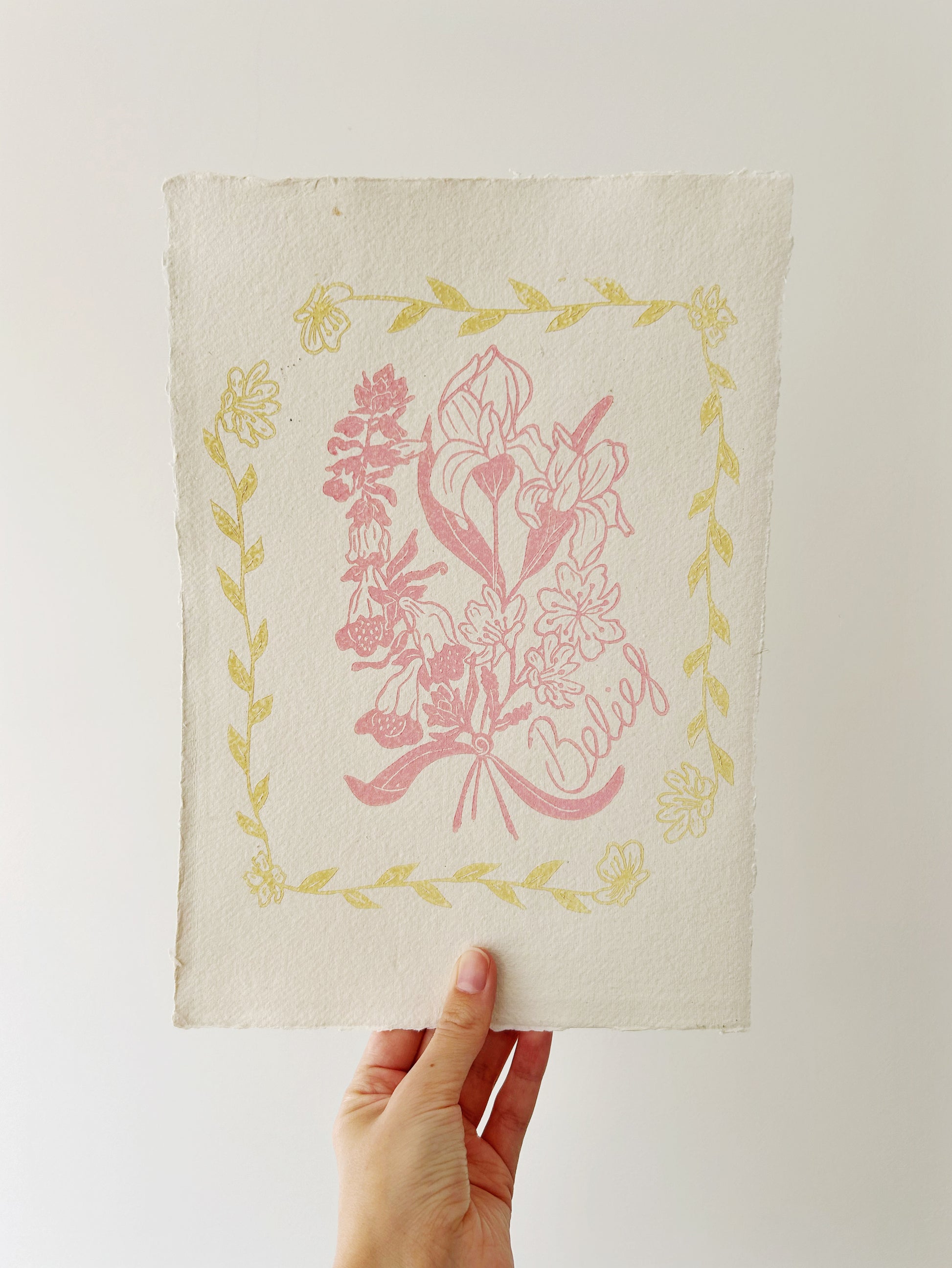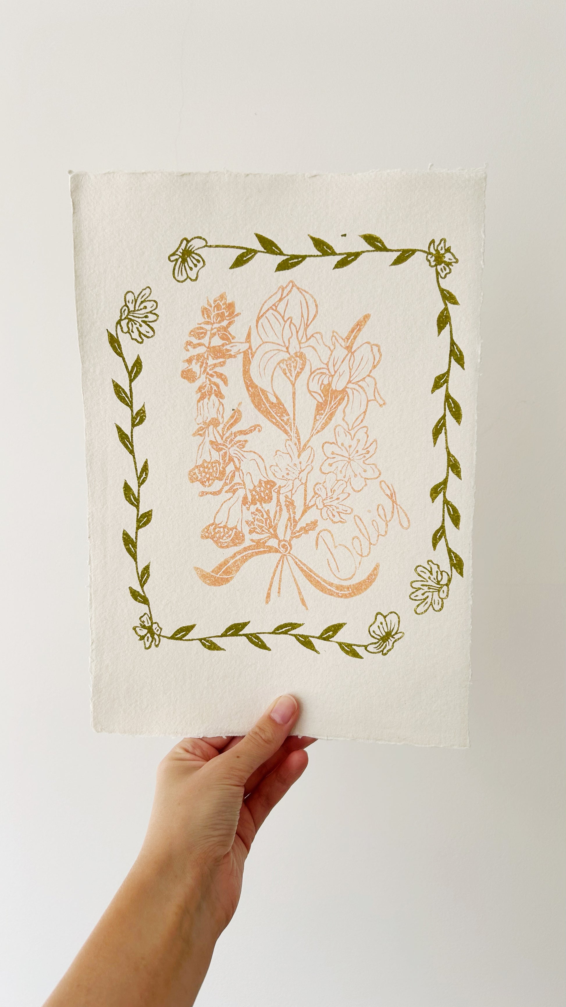 Using traditional hand carving and printing methods in her riverside Wivenhoe studio, Katie May creates Fleurs du Coeur botanical lino prints.