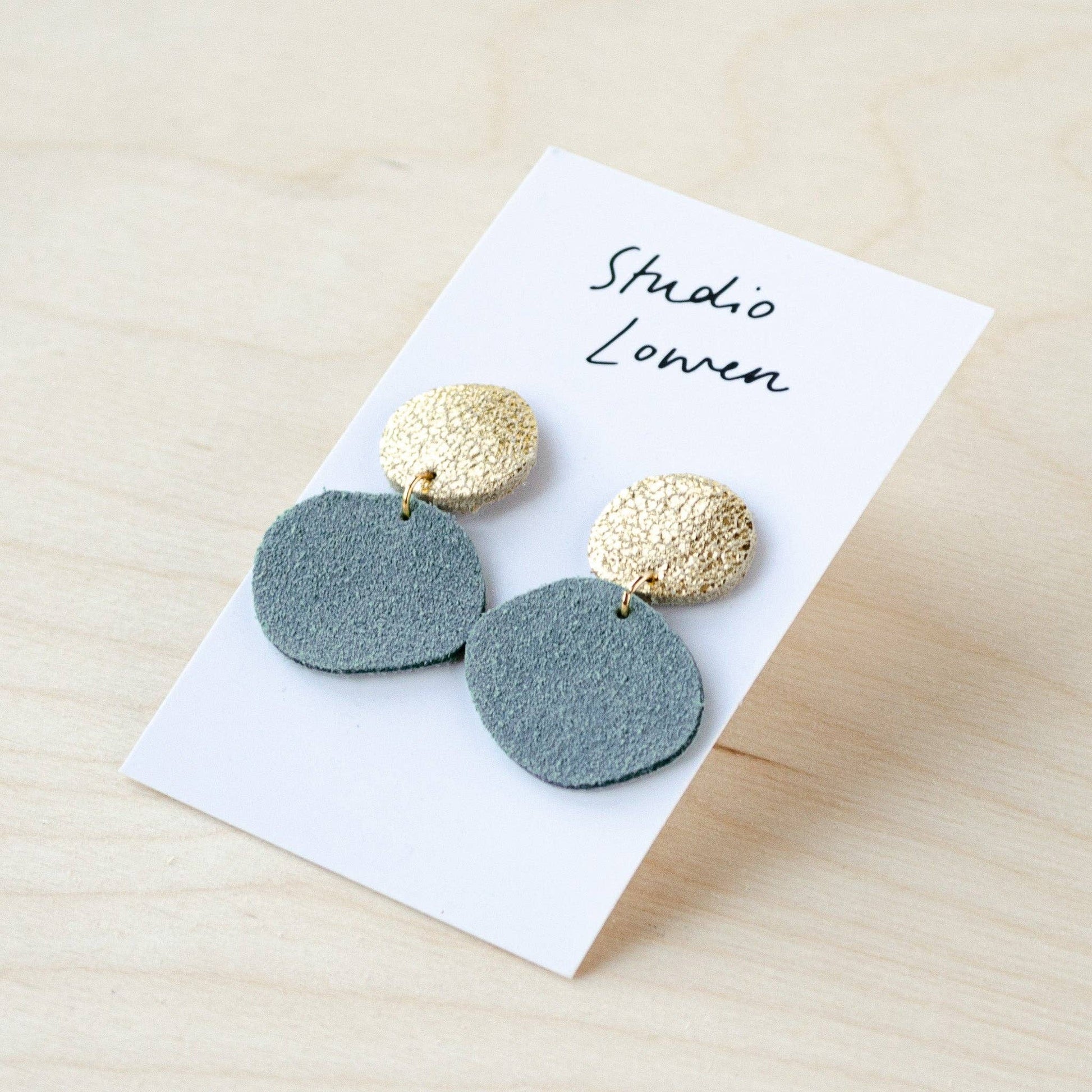 ''Bili'' means pebble in Cornish, these pebble earrings feature two circle offcuts, the top pebble is a leather Shimmer Gold stud, and then a second slightly larger pebble from suede.