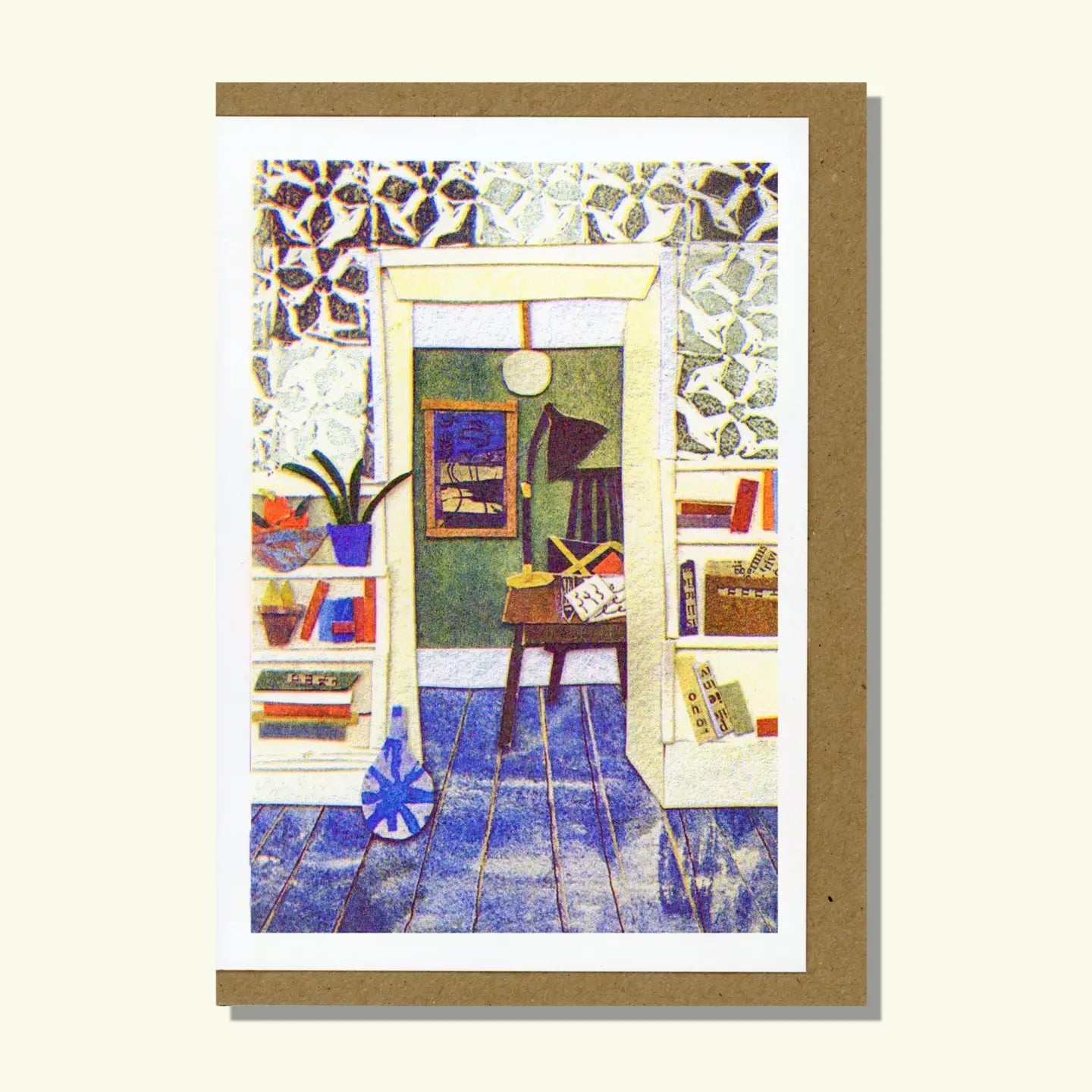 A single risograph greetings card depicting a home interior complete with blue floor boards and patterned wallpaper. The artwork is taken from an original collage created from found materials and hand-painted papers.