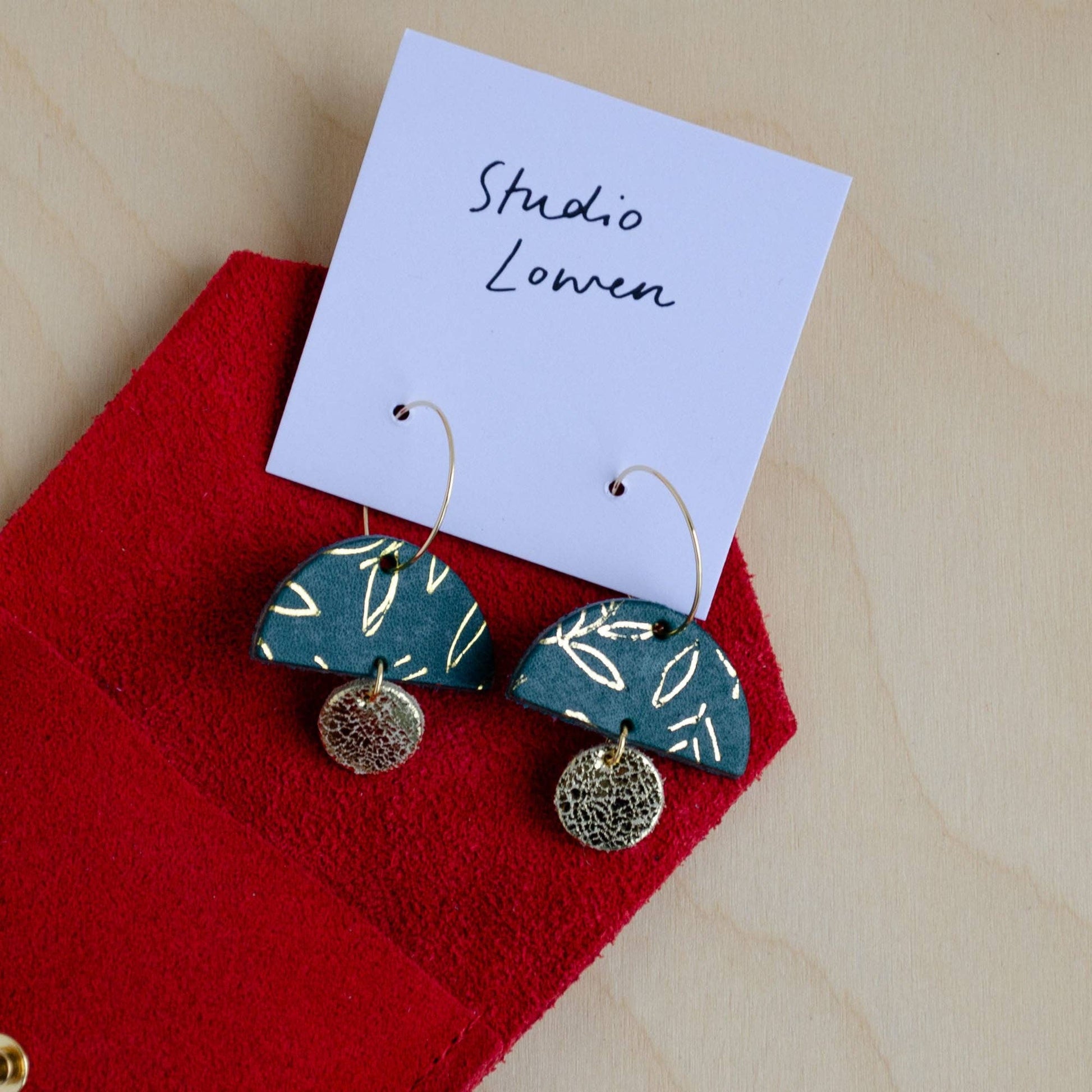 A beautiful forest green leather crescent moon shape in Forest Green leather which has a gold foil botanical design drawn onto the leather, finished off with a gold dot at the bottom.
