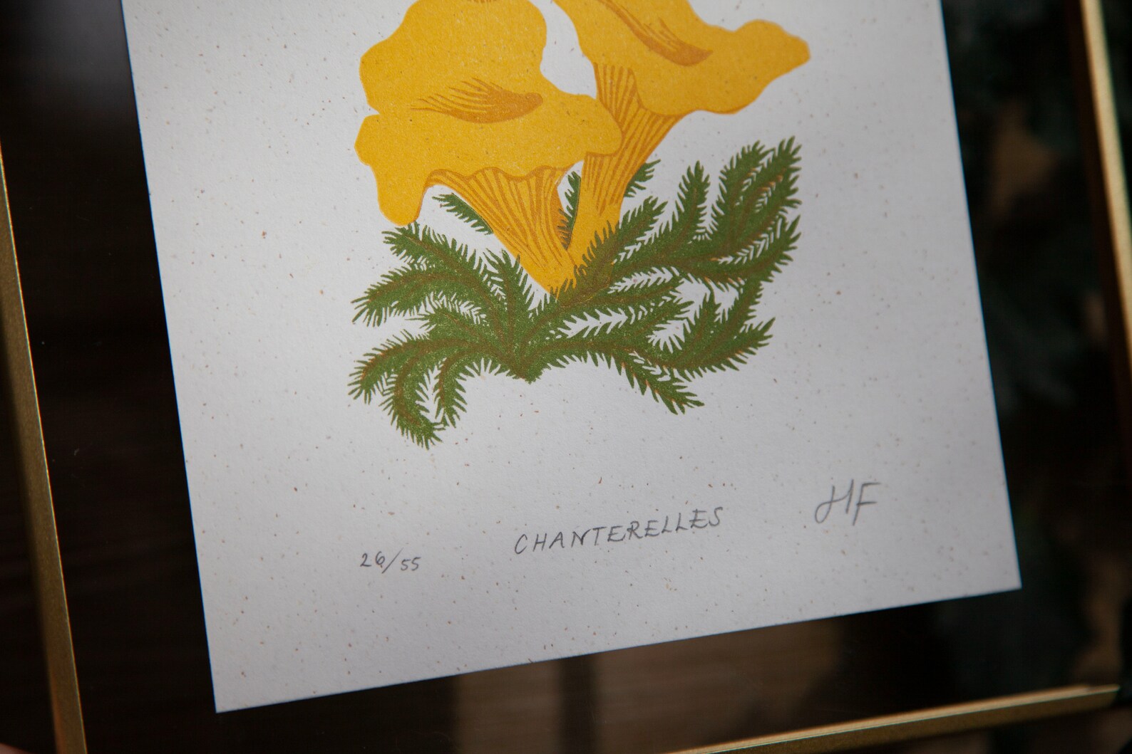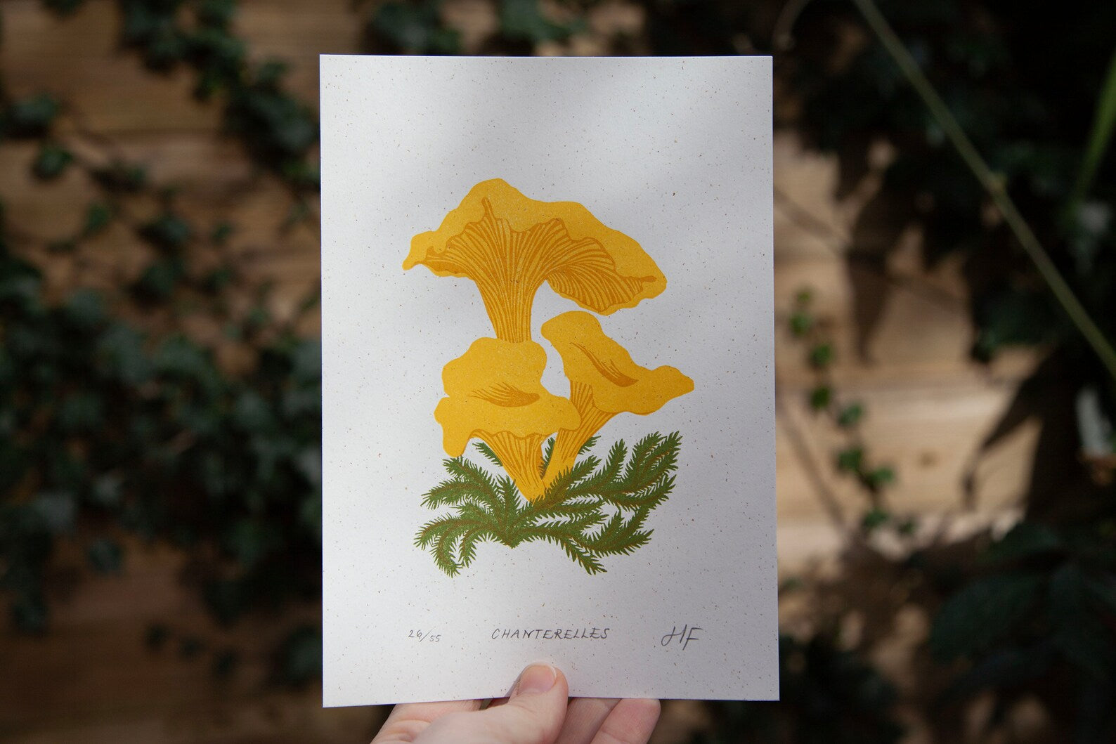 This beautiful A5 chanterelles linocut print is part of the 'Woodland' series by Suffolk artist Hannah Farthing. Inspired by the plant life found in the woodlands of the British Isles.