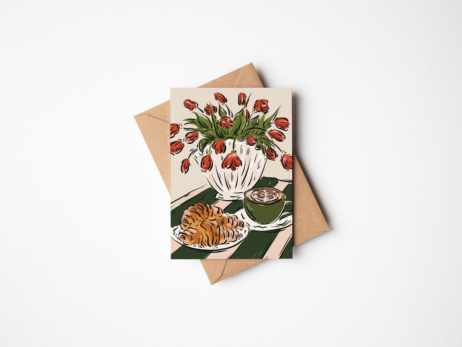 Coffee, Croissants and Tulips A6 Greeting Card with Kraft Envelope