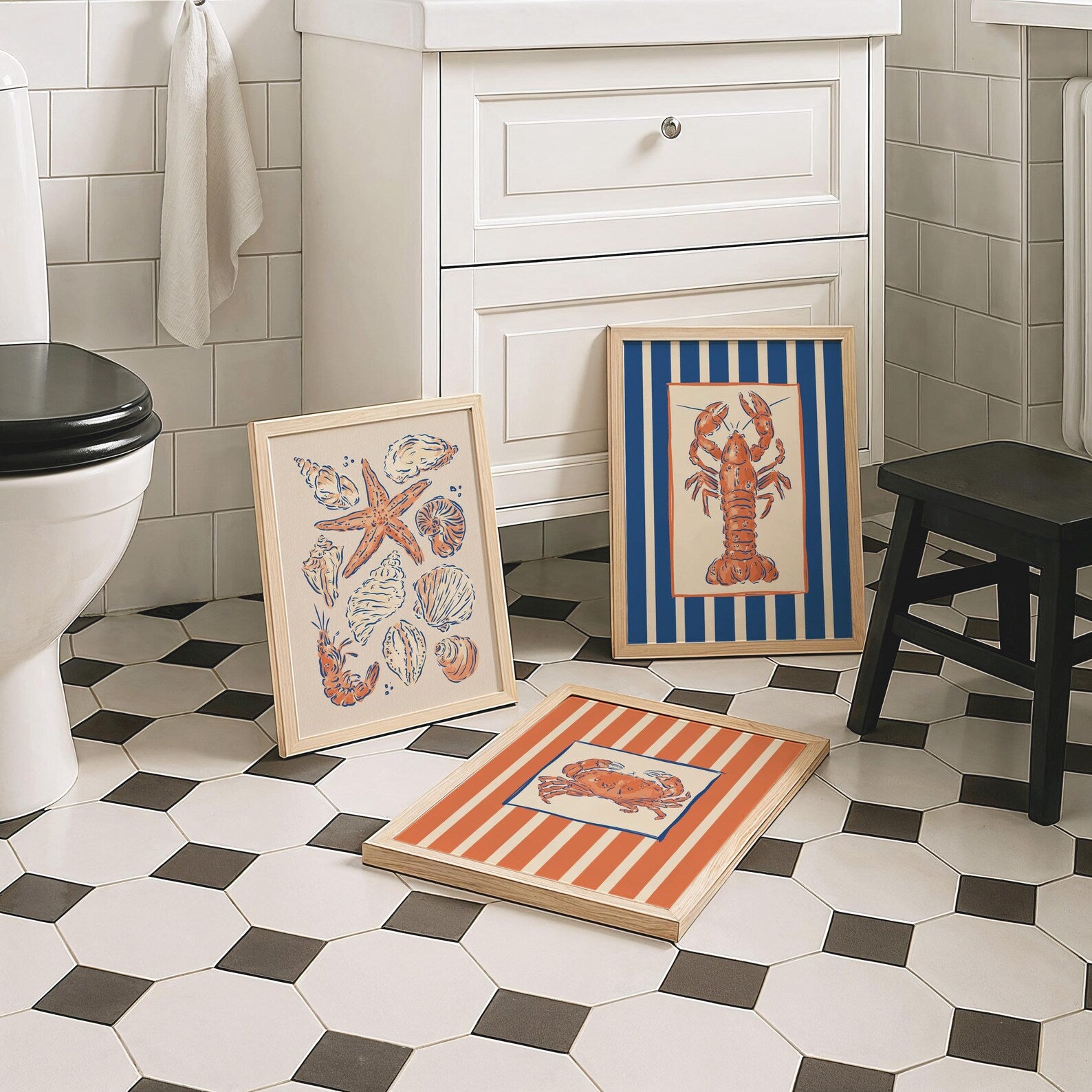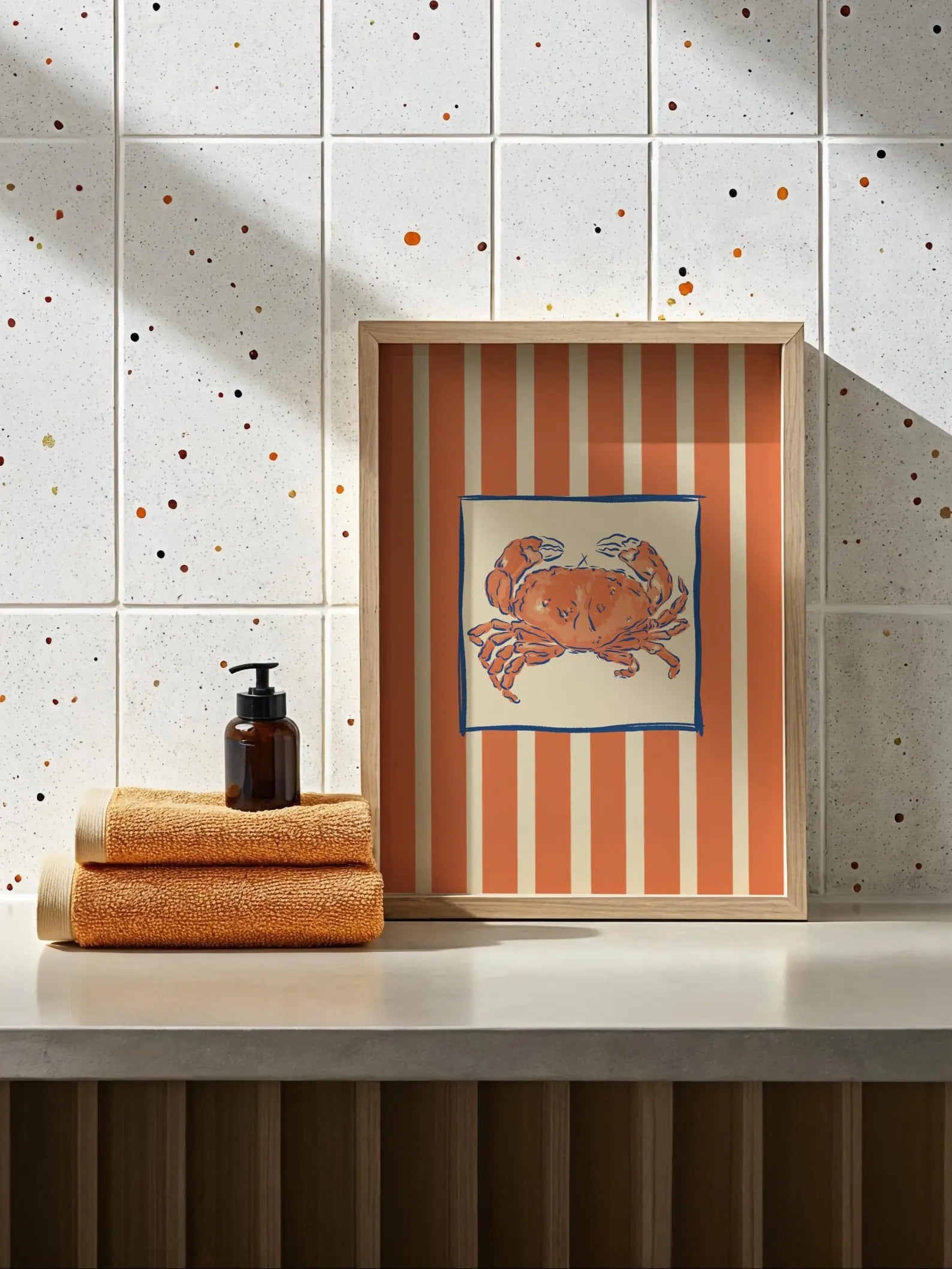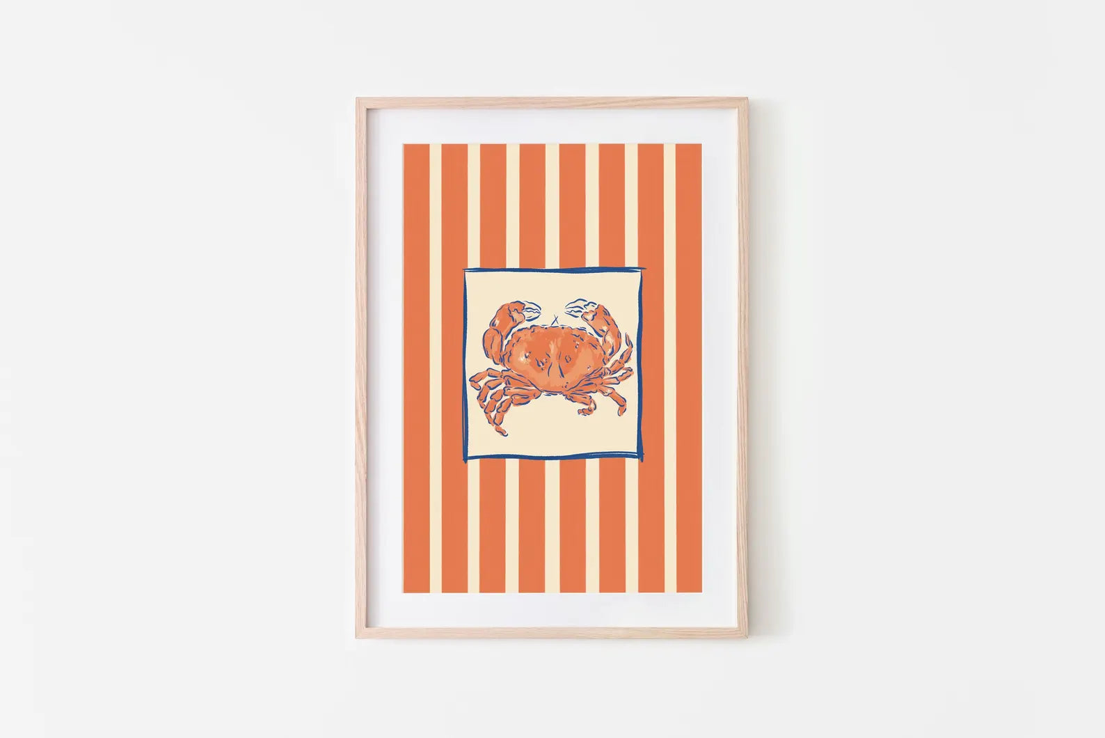 This fun coastal themed crab print would find its perfect place in any bathroom or coastal home. Pairs great with our blue stripe lobster print too!
