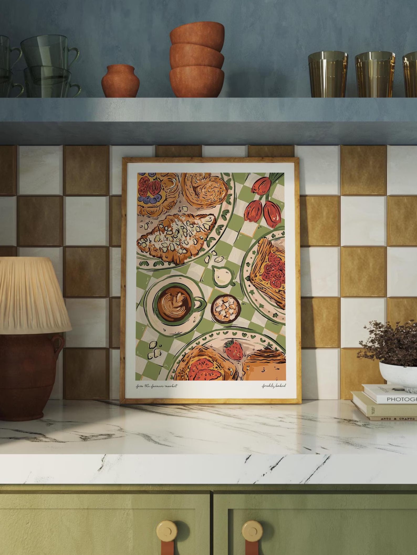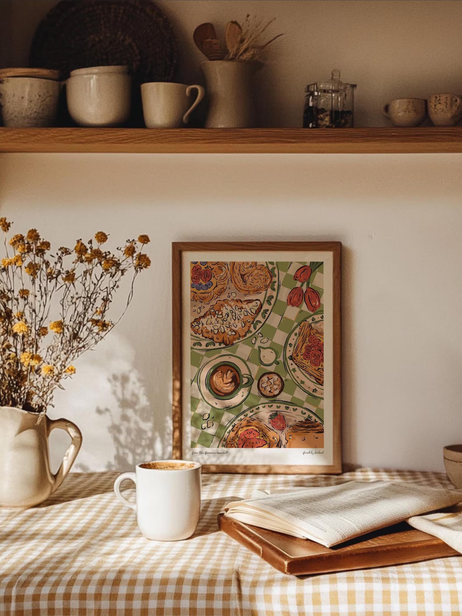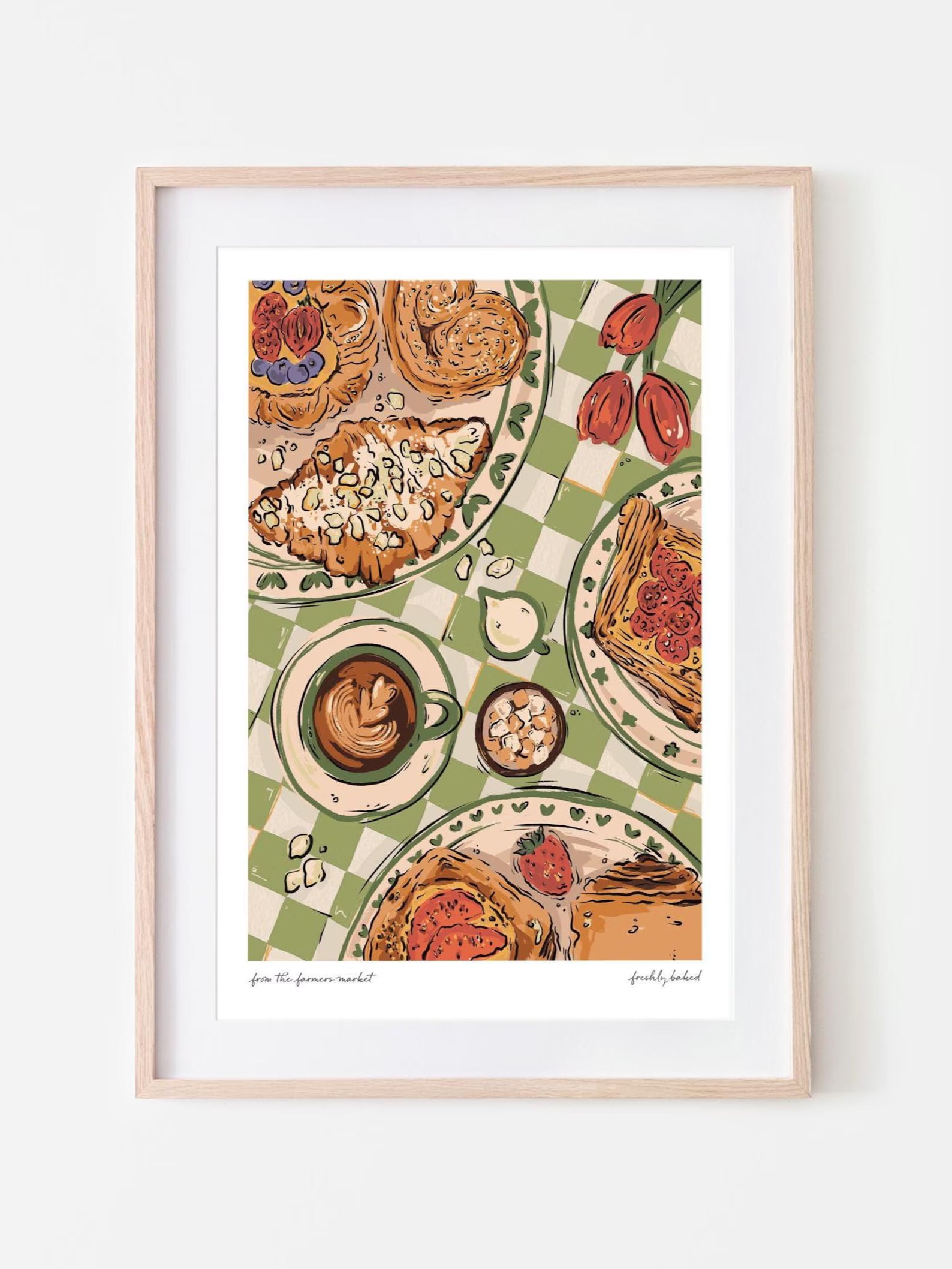 This print captures the simple joys of homemade treats and farmers market finds. Featuring a selection of fresh pastries, artisan coffee and red tulips, set against a pistachio green check tablecloth. Perfect for anyone that loves a little sweet treat."