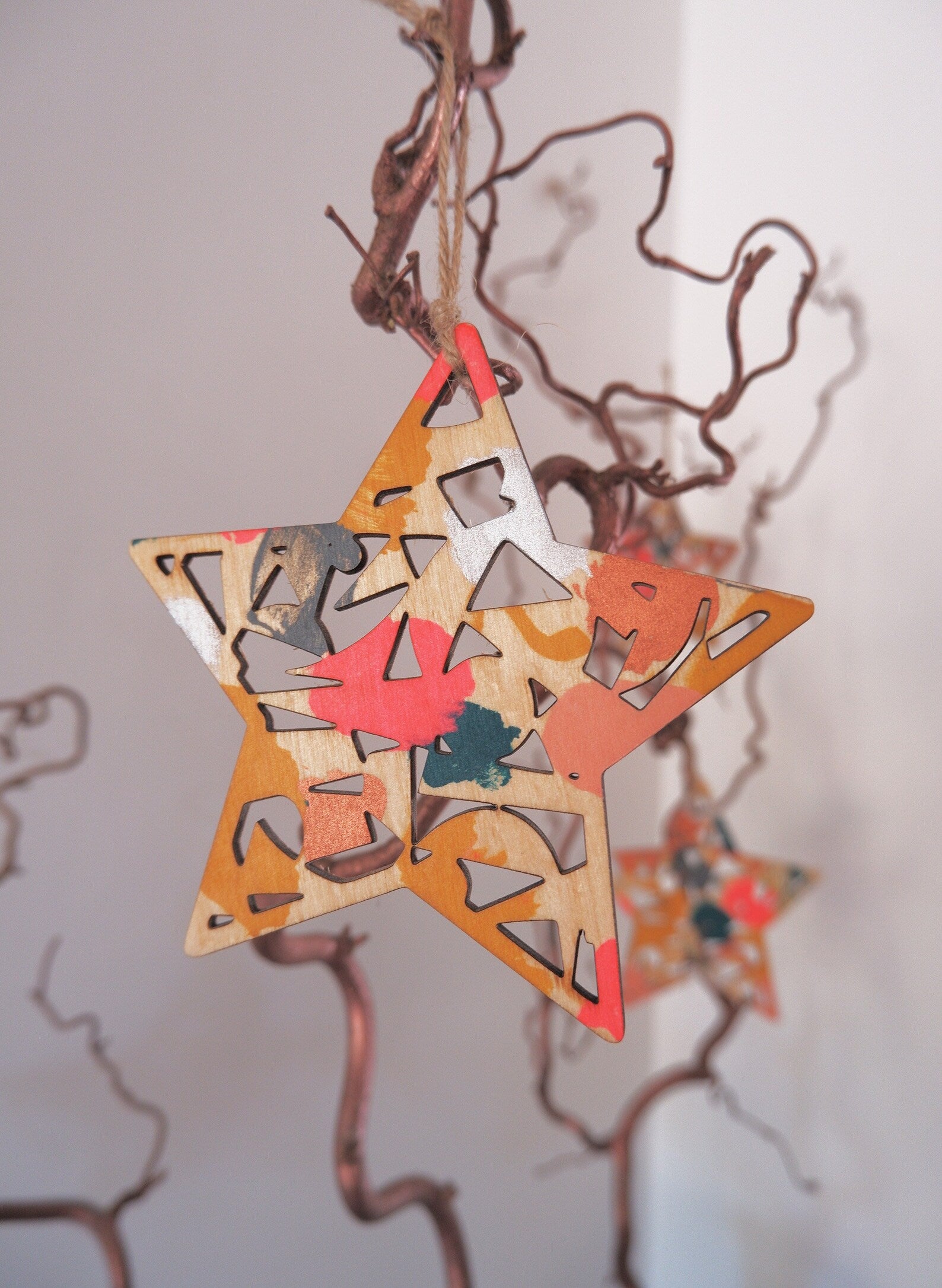 Birch plywood star Christmas decorations made from laser cut ply wood, screen printed with a range of colours, strung on natural jute cord.