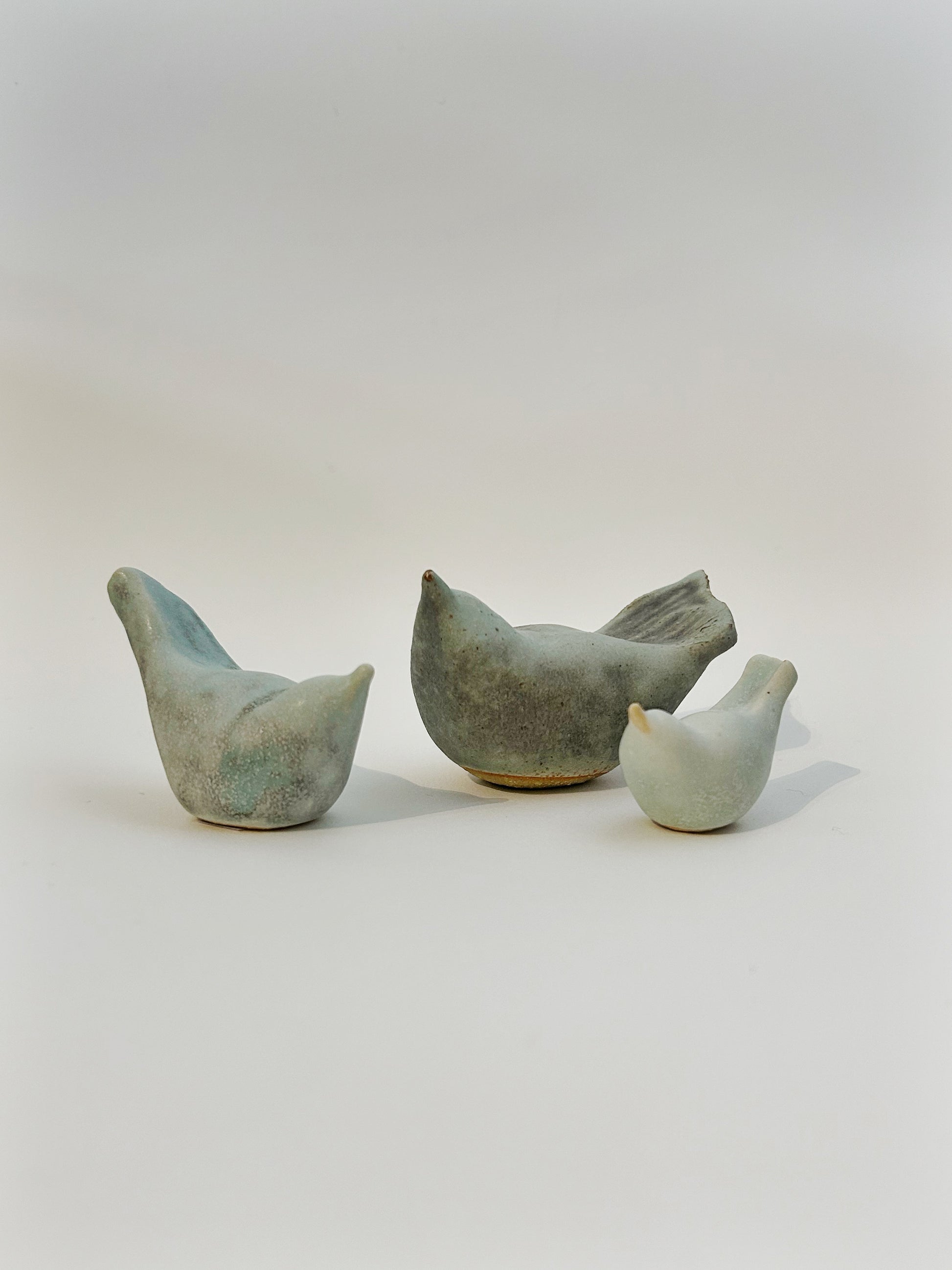 Each bird is sculpted by hand using either stone ware clay or fine porcelain. Each little bird is unique with its own character.