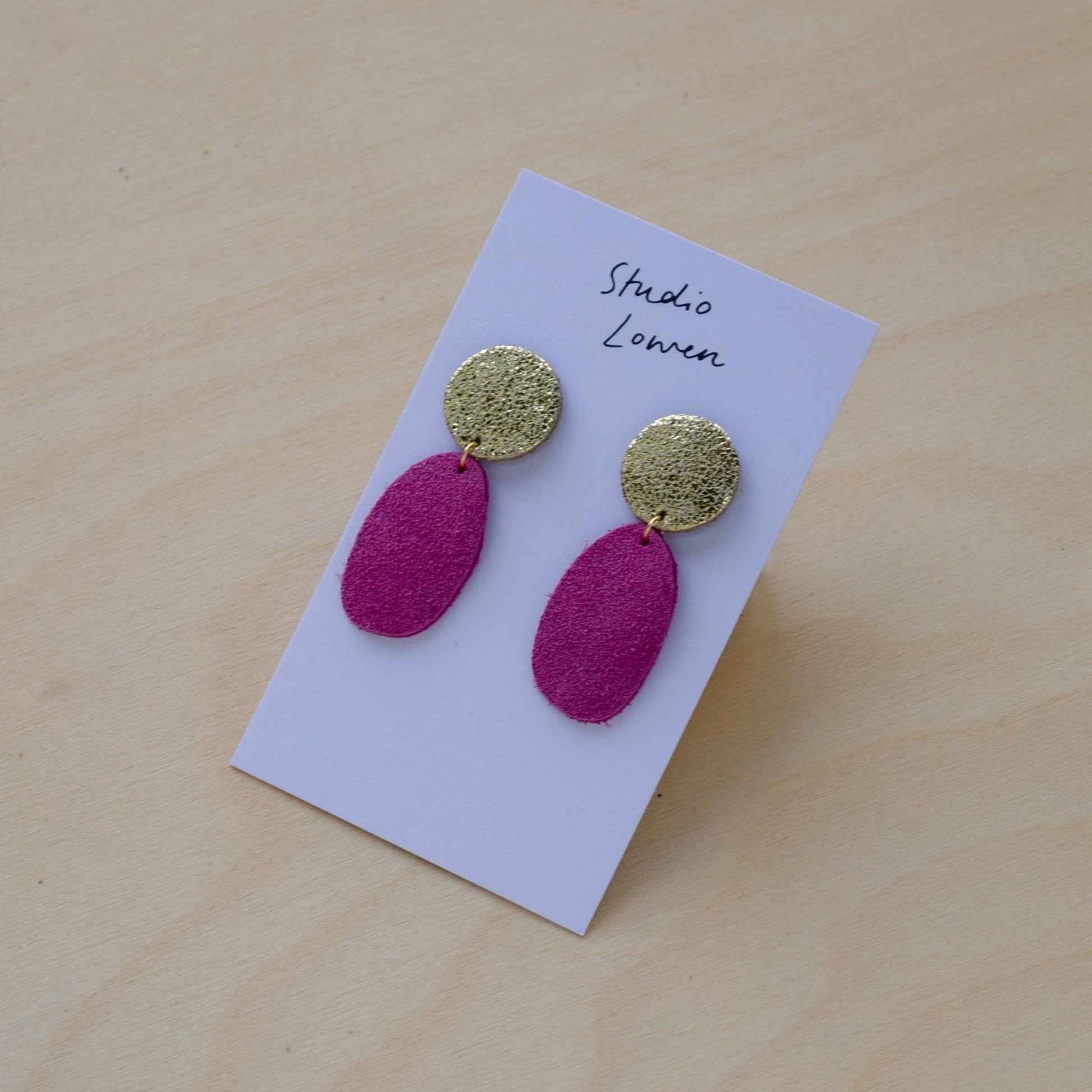 Made from offcuts of our beautiful suedes and leathers, these have a ''Shimmer Gold'' Stud, Size: 1.5cm width x 4cm drop.