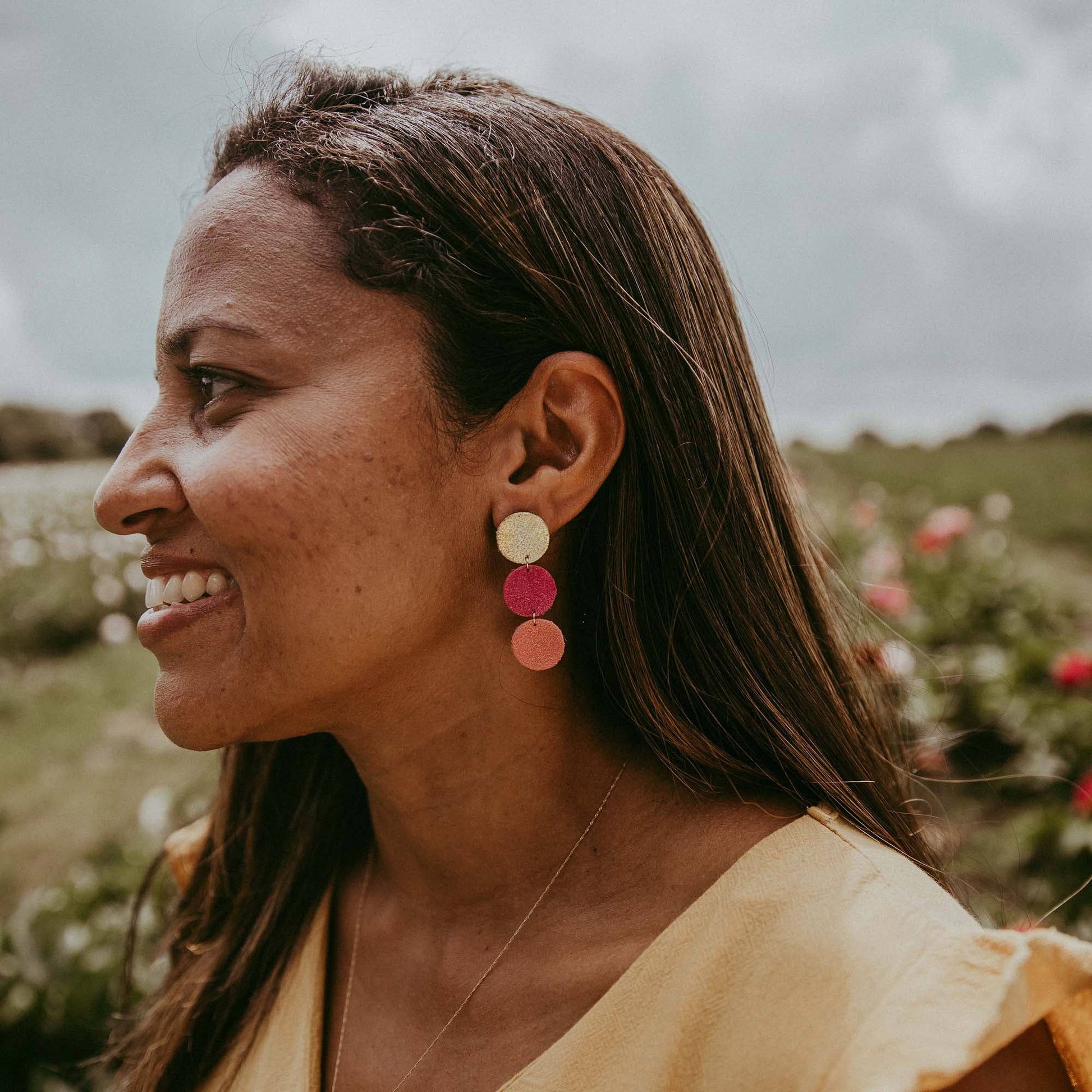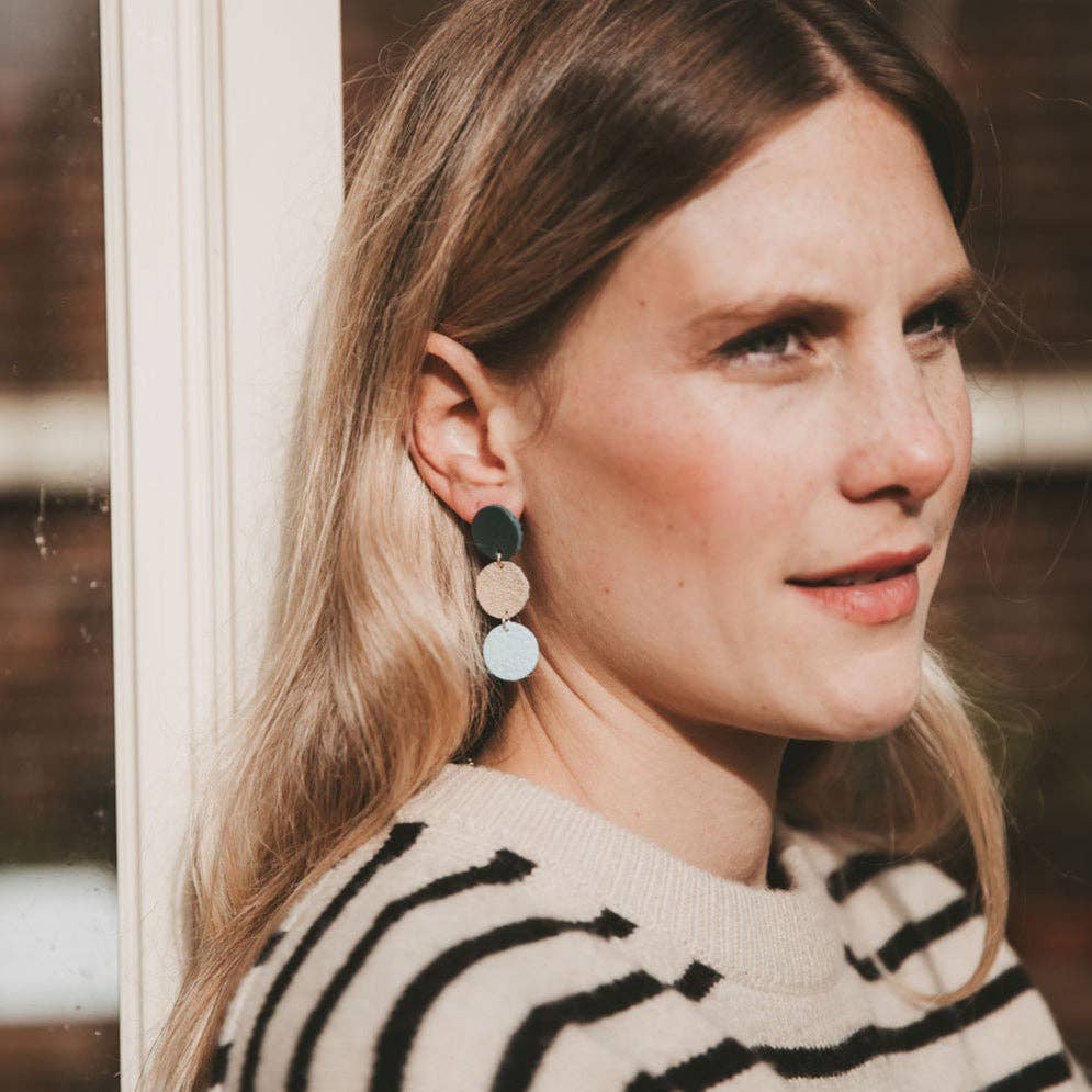 Made from 3 little circles of different colourful leather and suede in a circular tiered design. They are hand-crafted with offcuts of our suede and leather, making them incredibly lightweight compared to traditional metals, such as brass and silver. Using offcuts helps us to reduce our waste impact, something we feel passionately about; turning what would be otherwise unused into something beautiful gives us such joy.