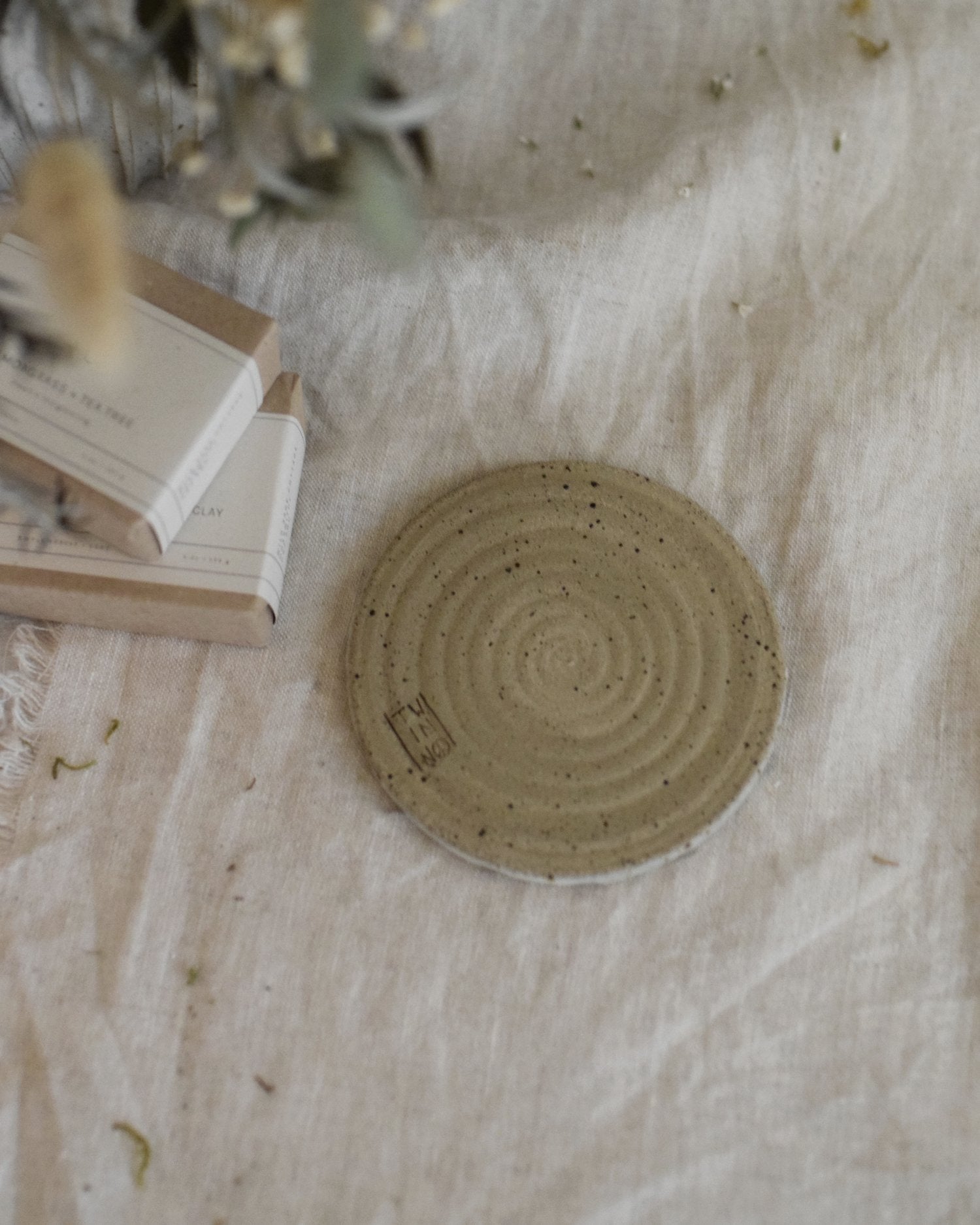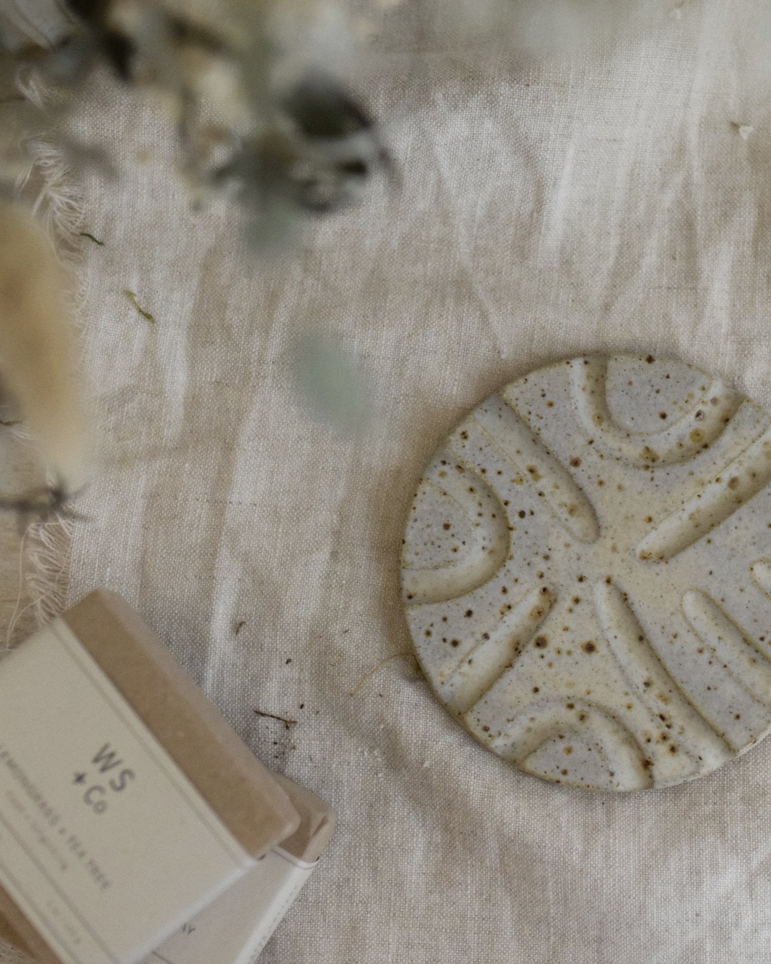 Soap Slab, wheel-thrown in pale speckled stoneware. Glazed in a satin white. Individually hand craved making each one little bit different.