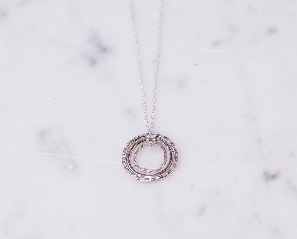 All 3 of the circles have a hammered finish but alternate in the way they are put on the chain, so there is always at least one textured ring showing no matter which way round you wear it.