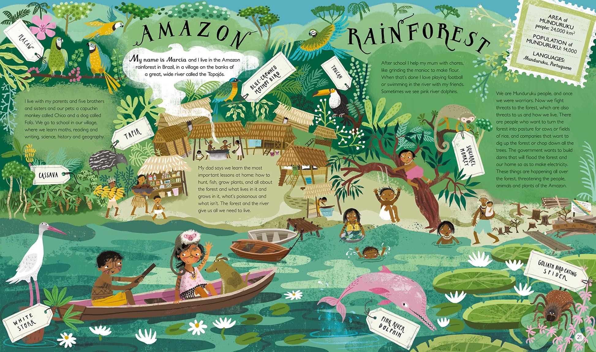 From the Sundarbans mangrove delta in Bangladesh to the rock houses of Cappadocia, and the African savannah to the Shetland Islands, this richly illustrated book reveals the ways that young people and their families live around the world. It explores the animals, plants, and weather conditions that the inhabitants encounter, and introduces readers to a variety of fascinating customs. Each of the 20 spreads focuses on one location and one individual to give a strong sense of personality and place.