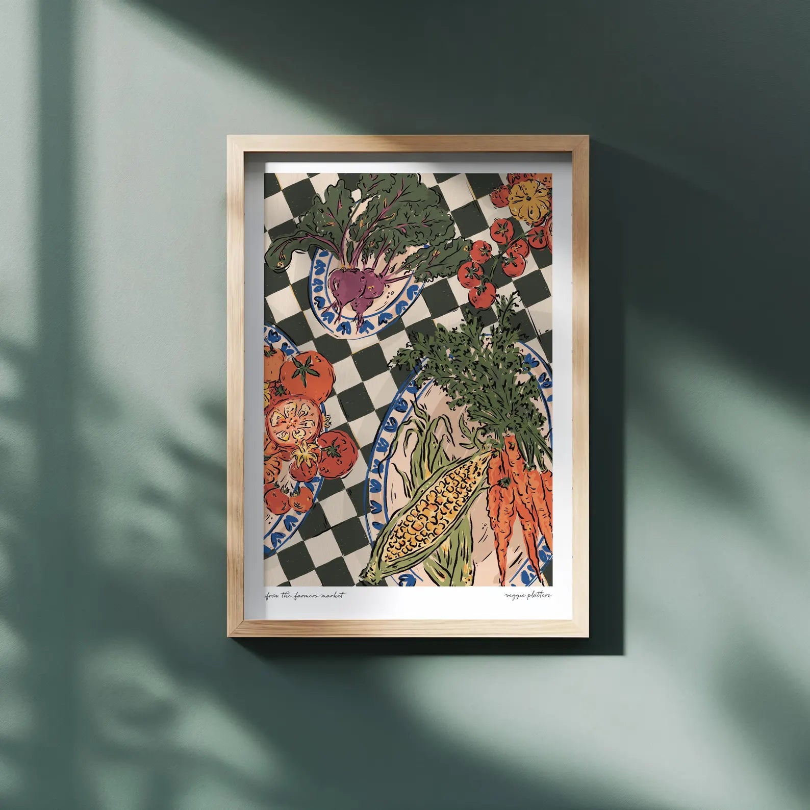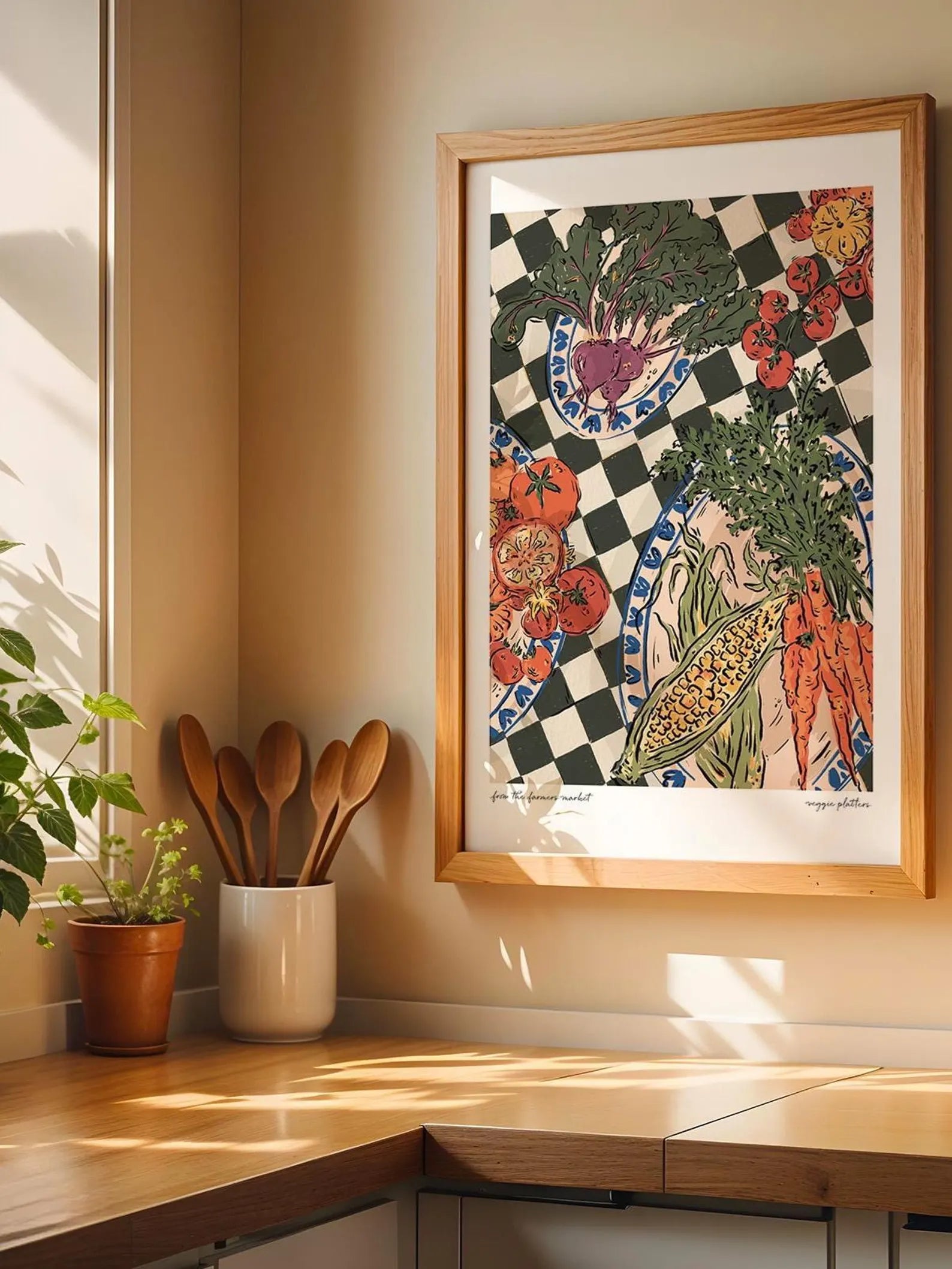 This print captures the simple joys of seasonal produce and farmers market finds. Featuring handpainted decorated plates of vegetables, including carrots, corn, beetroot and tomatoes, arranged on a bold checkerboard tablecloth. The perfect addition to a kitchen, dining nook or gallery wall."