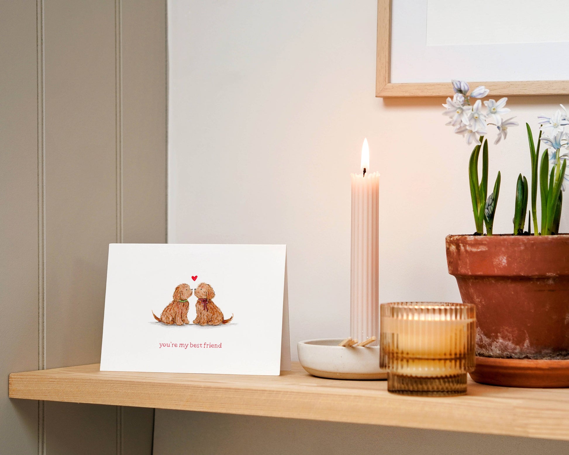 Celebrate someone special with this luxury illustrated greetings card, featuring charming watercolour cockapoos and hand-painted “You’re My Best Friend” lettering.